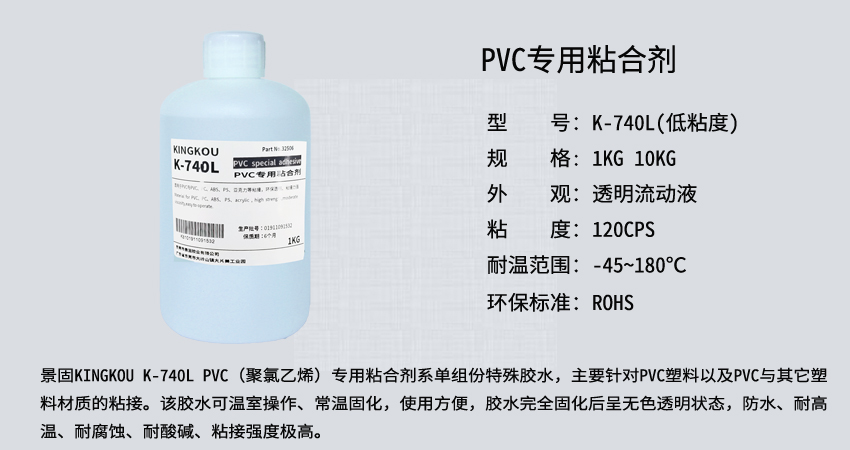 景固KINGKOU K-740 PVC(聚氯乙烯)專用粘合劑系單組份特殊膠水,主要針對(duì)PVC塑料以及PVC與其它塑料材質(zhì)的粘接。該膠水可溫室操作、常溫固化,使用方便,膠水完全固化后呈無色透明狀態(tài),防水、耐高溫、耐腐蝕、耐酸堿、粘接強(qiáng)度極高。