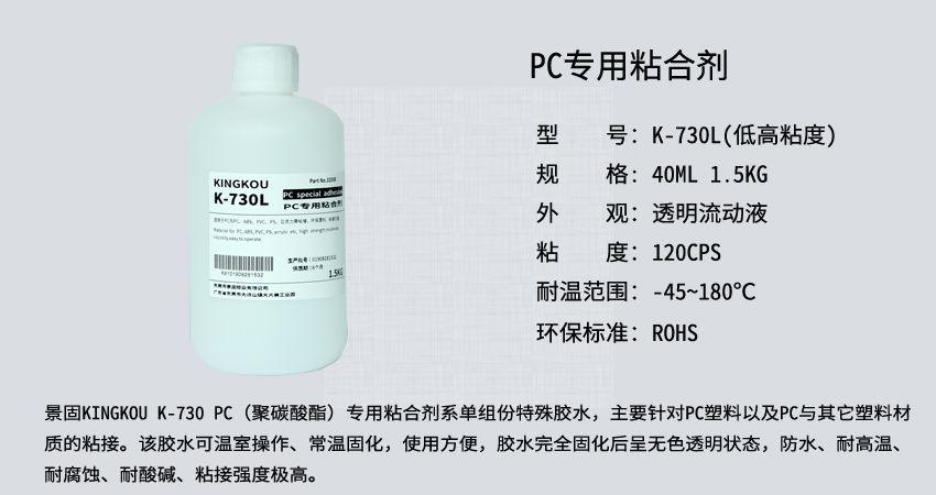 景固KINGKOU K-730 PC(聚碳酸酯)專用粘合劑系單組份特殊膠水,主要針對(duì)PC塑料以及PC與其它塑料材質(zhì)的粘接。該膠水可溫室操作、常溫固化,使用方便,膠水完全固化后呈無(wú)色透明狀態(tài),防水、耐高溫、耐腐蝕、耐酸堿、粘接強(qiáng)度極高。