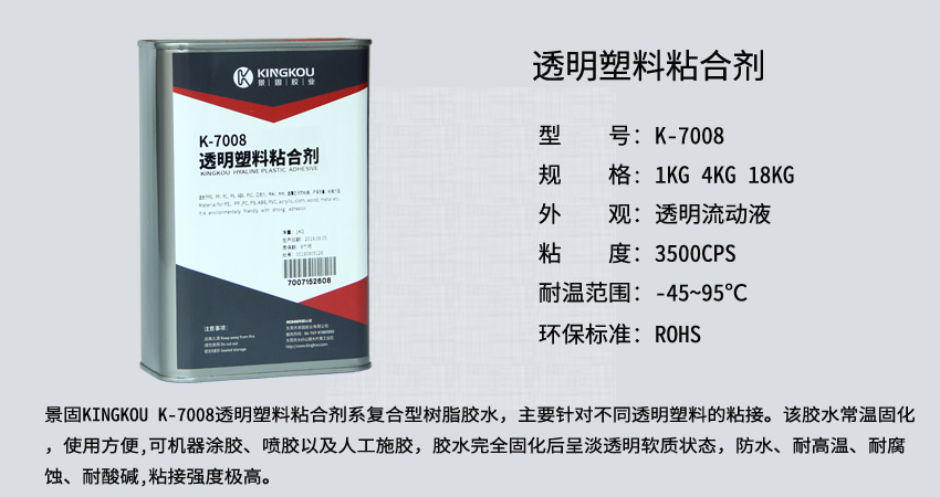 景固KINGKOU K-7008透明塑料粘合劑系復(fù)合型樹脂膠水,主要針對(duì)不同透明塑料的粘接。該膠水常溫固化,使用方便,可機(jī)器涂膠、噴膠以及人工施膠,膠水完全固化后呈淡透明軟質(zhì)狀態(tài),防水、耐高溫、耐腐蝕、耐酸堿,粘接強(qiáng)度極高。