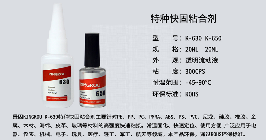 景固KINGKOU K-630特種快固粘合劑主要針對PE、PP、PC、PMMA、ABS、PS、PVC、尼龍、硅膠、橡膠、金屬、木材、海綿、皮革、玻璃等材料的高強(qiáng)度快速粘接。常溫固化、快速定位、使用方便、固化后的膠層具有耐高低溫、防水密封、耐弱酸堿、耐油等優(yōu)異性能。廣泛應(yīng)用于電器、儀表、機(jī)械、電子、玩具、醫(yī)療、輕工、軍工、航天等領(lǐng)域。通過ROHS環(huán)保標(biāo)準(zhǔn)。