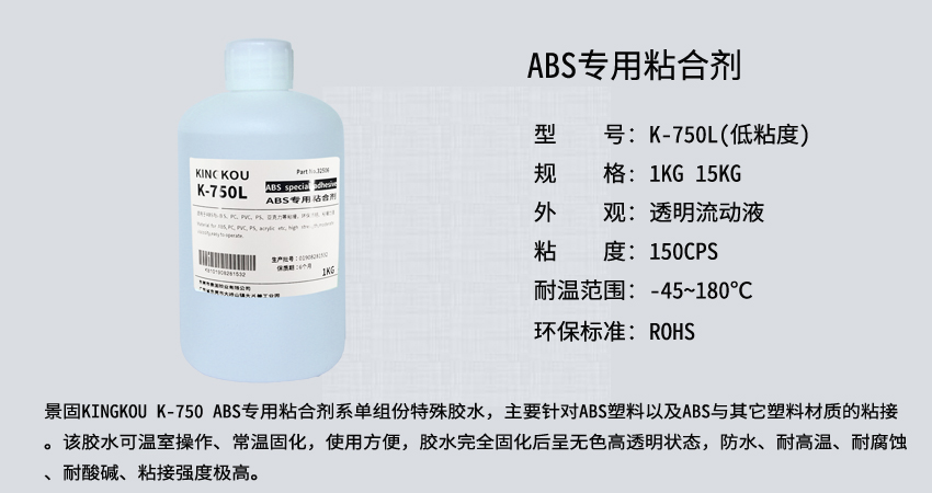景固KINGKOU K-750 ABS專用粘合劑系單組份特殊膠水,主要針對ABS塑料以及ABS與其它塑料材質的粘接。該膠水可溫室操作、常溫固化,使用方便,膠水完全固化后呈無色高透明狀態(tài),防水、耐高溫、耐腐蝕、耐酸堿、粘接強度極高。