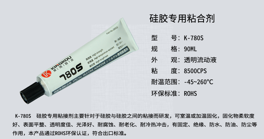 景固KINGKOU   K-780S透明硅膠專用膠水系專業(yè)針對硅膠材質(zhì)的粘接所研發(fā),避免了傳統(tǒng)膠水粘接硅膠后發(fā)硬變脆、出現(xiàn)白化、氣味重、耐侯性差等缺點,該膠透明、環(huán)保無毒、無刺激性異味、柔軟度好!固化后呈軟質(zhì)彈性狀態(tài),可彎折,不發(fā)白,強度高,耐酸堿,耐高溫,防水性能強!