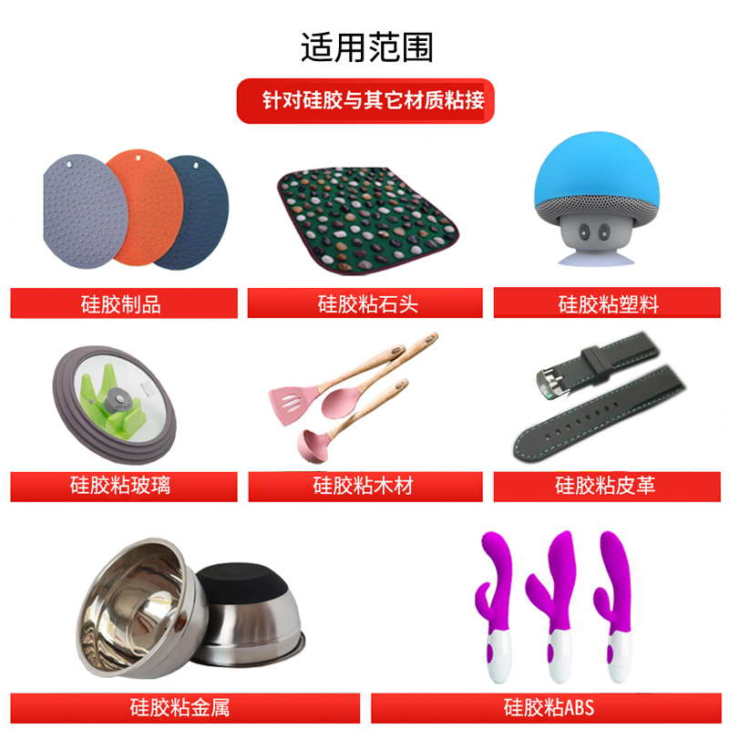 主要用于:硅膠與ABS、硅膠與PS、硅膠與PC、硅膠與PMMA、硅膠與其他塑料、硅膠與金屬(不銹鋼、鋁合金、鐵、銅、合金料)等之間的粘接。固化后柔軟有彈力,粘性強(qiáng)!并且防水、防潮、耐油、耐老化、抗震動、絕緣等特性!