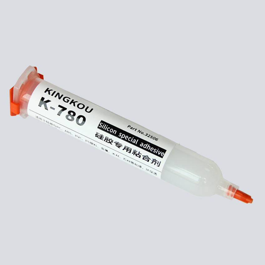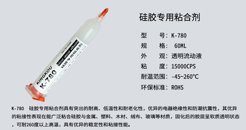 景固KINGKOU  K-780透明硅膠專用膠水系專業(yè)針對硅膠與塑料、硅膠與金屬、硅膠與玻璃、木材、絨布、皮革等材質(zhì)的粘接所研發(fā),避免了傳統(tǒng)膠水粘接后發(fā)硬變脆、出現(xiàn)白化、氣味重、耐侯性差等缺點(diǎn),該膠透明環(huán)保、無刺激性異味、柔軟度好!固化后呈軟質(zhì)彈性狀態(tài),可彎折,不發(fā)白,強(qiáng)度高,耐酸堿,耐高溫,防水性能強(qiáng)!