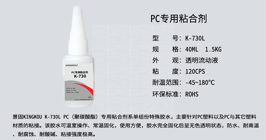景固KINGKOU K-730 PC(聚碳酸酯)專用粘合劑系單組份特殊膠水,主要針對PC塑料以及PC與其它塑料材質(zhì)的粘接。該膠水可溫室操作、常溫固化,使用方便,膠水完全固化后呈無色透明狀態(tài),防水、耐高溫、耐腐蝕、耐酸堿、粘接強(qiáng)度極高。