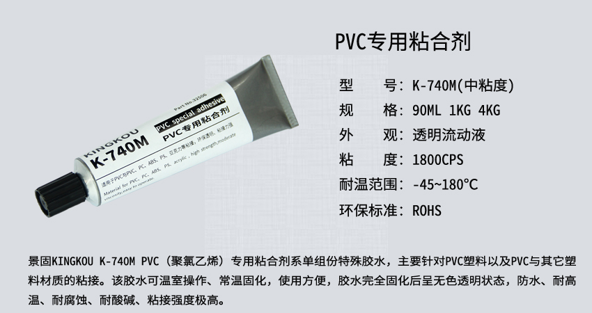 景固KINGKOU K-740 PVC(聚氯乙烯)專用粘合劑系單組份特殊膠水,主要針對PVC塑料以及PVC與其它塑料材質(zhì)的粘接。該膠水可溫室操作、常溫固化,使用方便,膠水完全固化后呈無色透明狀態(tài),防水、耐高溫、耐腐蝕、耐酸堿、粘接強度極高。