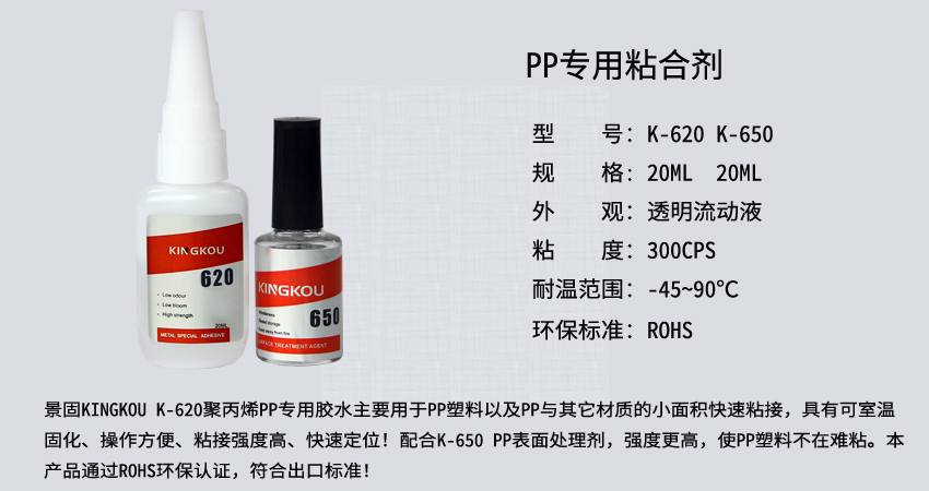 景固KINGKOU K-620聚丙烯PP專用膠水主要用于PP塑料以及PP與其它材質(zhì)的小面積快速粘接,具有可室溫固化、操作方便、粘接強(qiáng)度高、快速定位!配合K-650 PP表面處理劑,強(qiáng)度更高,使PP塑料不在難粘。本產(chǎn)品通過(guò)ROHS環(huán)保認(rèn)證,符合出口標(biāo)準(zhǔn)!