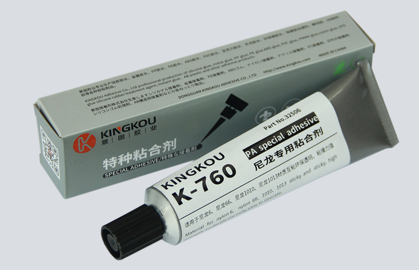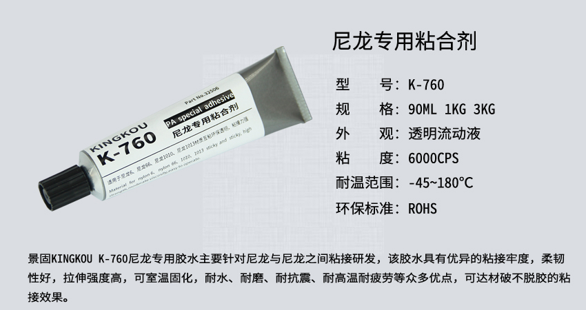 景固KINGKOU K-760尼龍專用膠水主要針對尼龍與尼龍之間粘接研發(fā),該膠水具有優(yōu)異的粘接牢度,柔韌性好,拉伸強(qiáng)度高,可室溫固化,耐水、耐磨、耐抗震、耐疲勞等眾多優(yōu)點(diǎn),可達(dá)材破不脫膠的粘接效果。